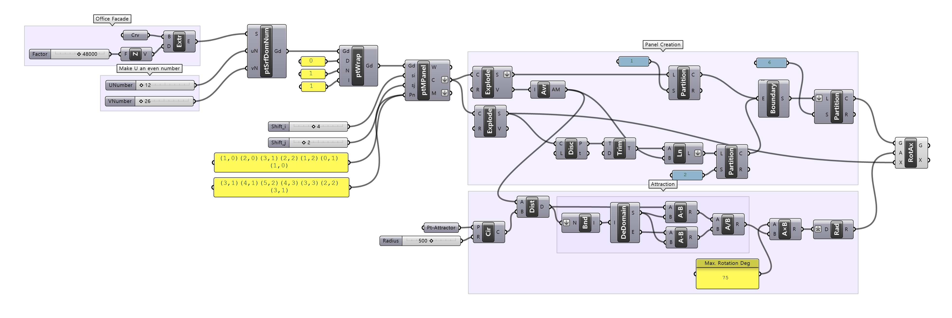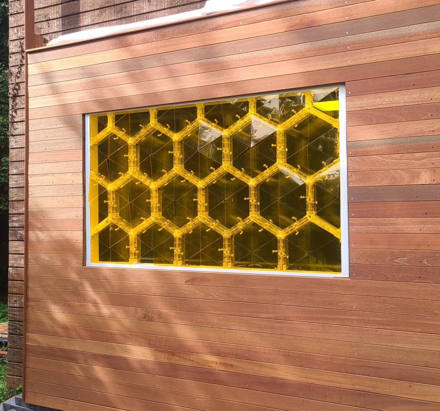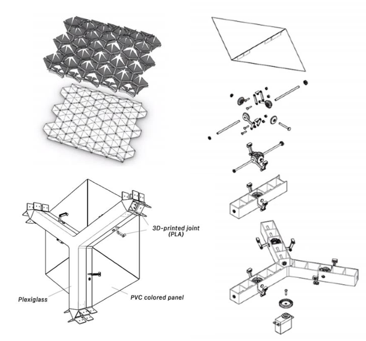 Starting with a hexagonal shape composed of six triangular panels, a regular tessellated foldable surface driven by an electric motor was refined to conceal the motor frame. The Rhino Grasshopper Paneling tool was used to test the parametric elevation design. Gear systems are designed with Fusion 360. The kinetic modules were seamlessly applied to one side of the experimental house’s wall. The opening ratio of the modules continuously changes based on the external reference.
