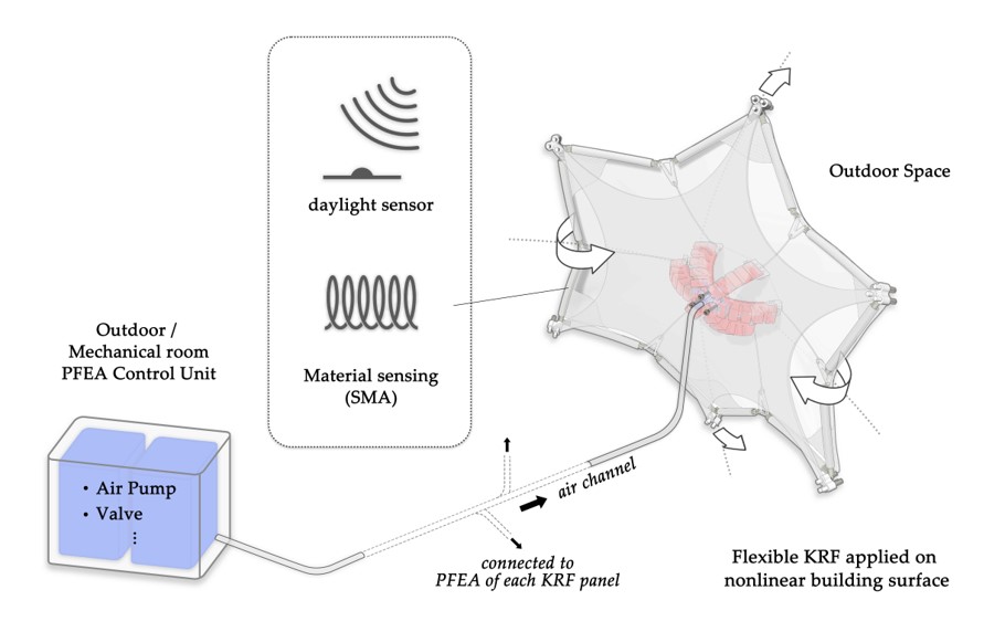 The geometrical inflexibility of rigid-body kinetic building facades is disadvantageous in free-form architecture. To address this problem, a gearless, lightweight, and geometrically flexible daylight-adaptive shading facade module is proposed by hybridizing gripper-shaped pneumatic elastomer and shape memory alloy(SMA) actuators. This project presents an advanced architectural application of soft robotics technology and smart material. Detailed information can be found in the published journal “Flexural biomimetic responsive building façade using a hybrid soft robot actuator and fabric membrane” at Automation in Construction, Link.