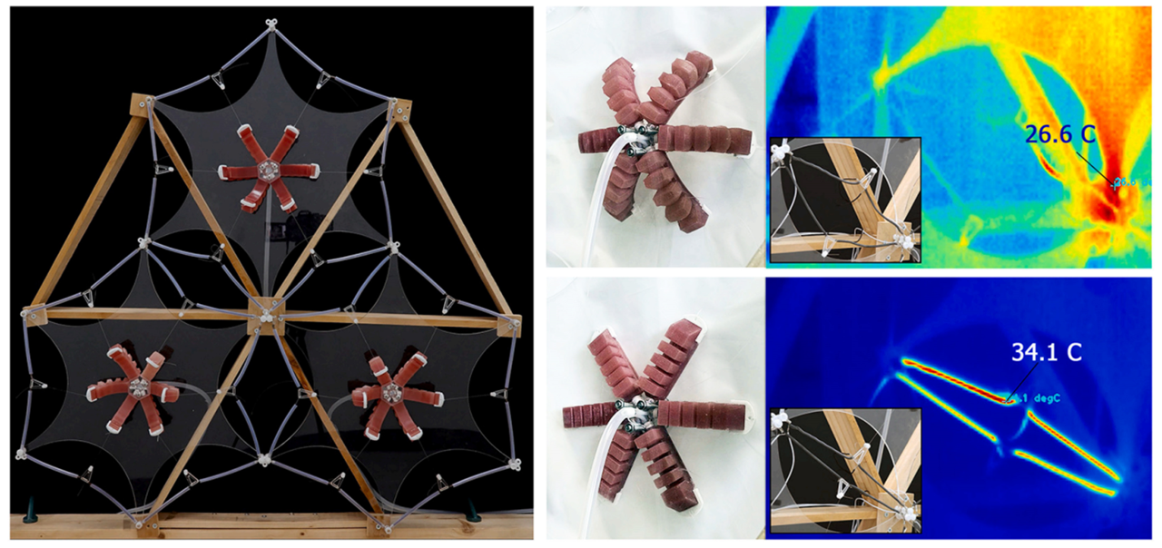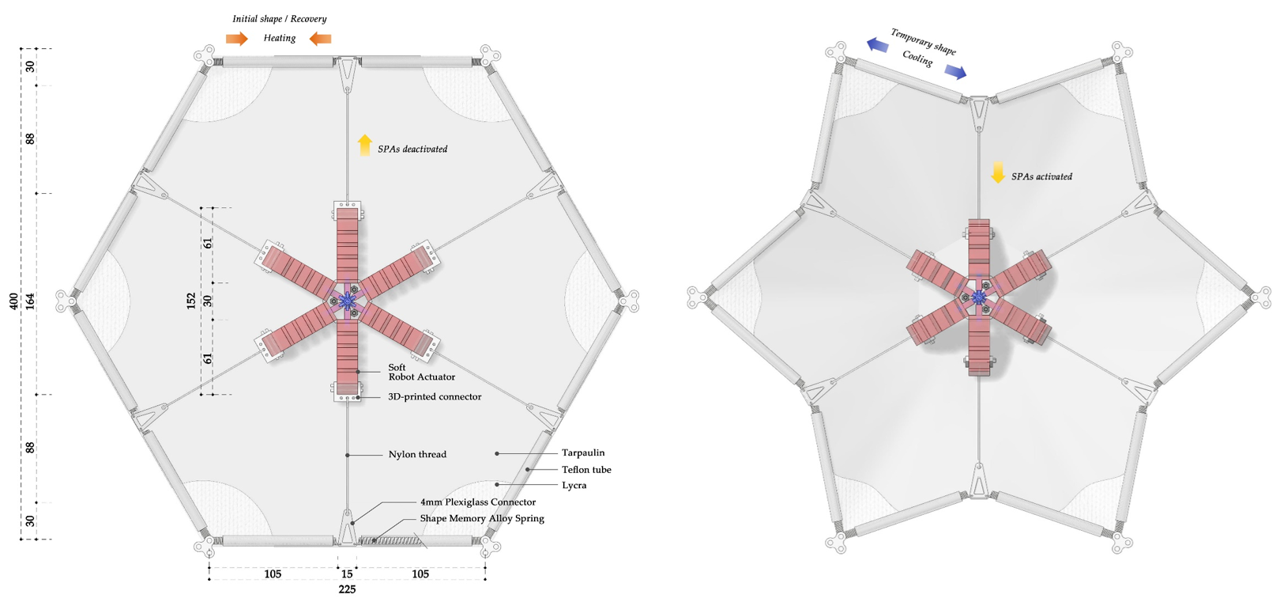 The revised deformation patterns and locations are centered around the corners of the hexagon, opening and closing in the form of the stomata of a cactus-like plant. These opening and closing deformations are created by pneumatic actuators located in the center of the hexagonal panel, pulling the membrane back and forth. SMA wires are inserted into the corners of the membrane, improving restore movement (closing) when the temperature rises.