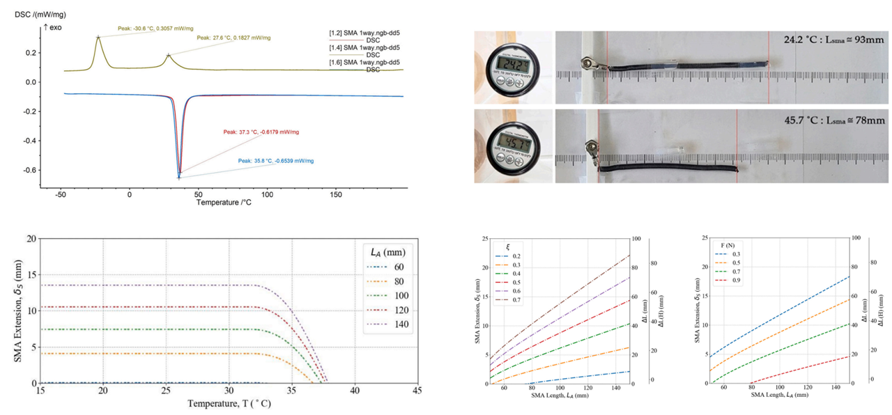 The SMA wire became a form of coil spring to secure an adequate deformation rate, and the diameter of the wire and spring was determined through several quantitative analyses, such as sensitivity analysis, DSC test, and performance simulation. The fabricated SMA starts its actuation at a temperature range between 32˚C and 36˚C.