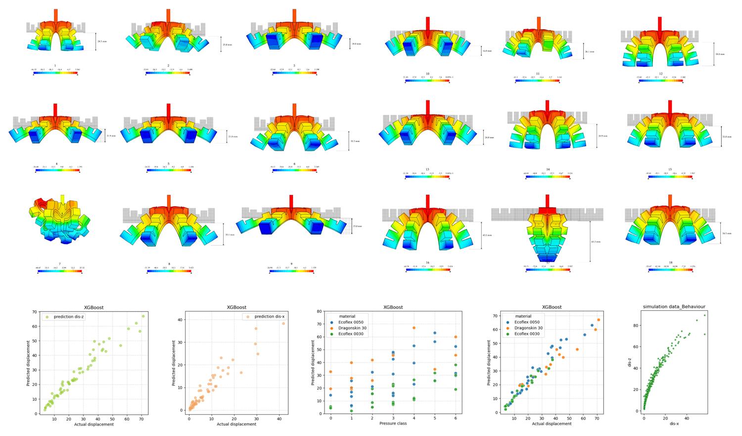 To predict the non-linear behavior of hyper-elastic materials, 18 models were selected through the Taguchi Method with 8 parametric variables. Each model was tested with the combination of 4 materials with different elasticity and 6 different pressure level classifications. The optimized condition that produces the most stable movement was selected. A machine learning-based prediction model was established for better decision-making.