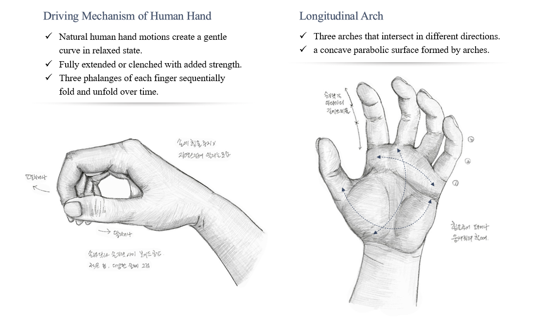 Our gripper design evolved around the emulation of the real hand using the pre-stressed driving mechanism for prototyping object grasping performance. Sketches illustrate naturally bent curves and three arches of hand shape.