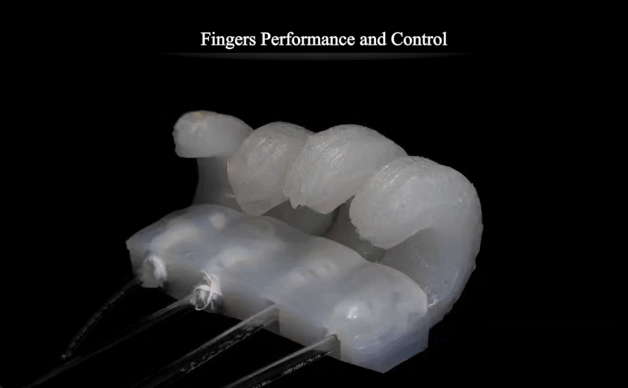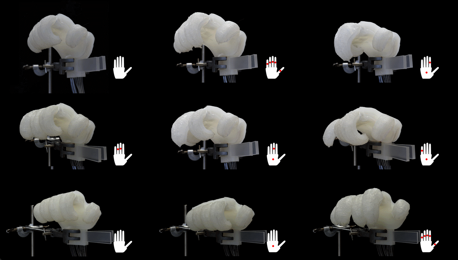 When air is supplied, the finger modules spread while the palm module bends. Each module can be actuated independently, enabling the hand gripper to move dexterously.