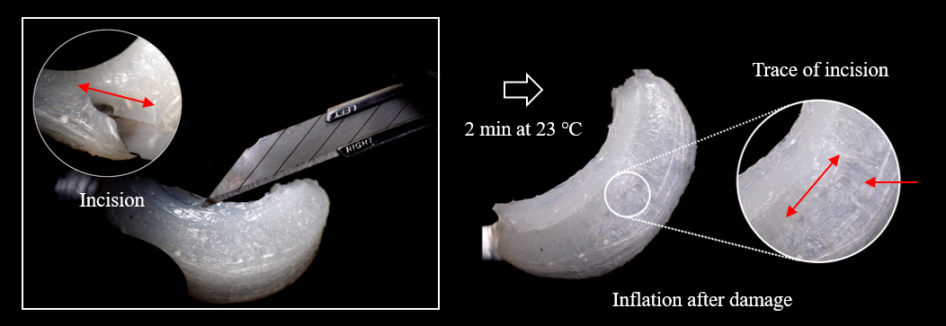 An 8 mm deep, 15 mm wide incision was made on the actuator, fully damaging the internal air chamber. After resting for two minutes at room temperature, the actuator showed substantial recovery, with minimal surface traces of the cut. It also maintained consistent inflation performance, displaying no air leakage after over 20 injection tests.