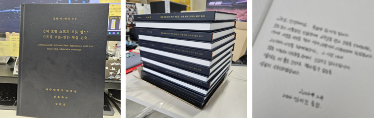 I’m thrilled to share that I’ve officially received my master’s degree! My thesis, titled “Anthropomorphic Soft Robot Hand: Application in Multi-task Human-robot Collaborative Architecture”. was an interdisciplinary project in collaboration with the Energy System Engineering Department. I’m especially grateful to Dr. R. Yeasmin for sharing her invaluable insights on self-healing material with me. This successful joint research has broadened my academic perspective, taught me how to make a good question, and helped me recognize my strengths as a building researcher.
